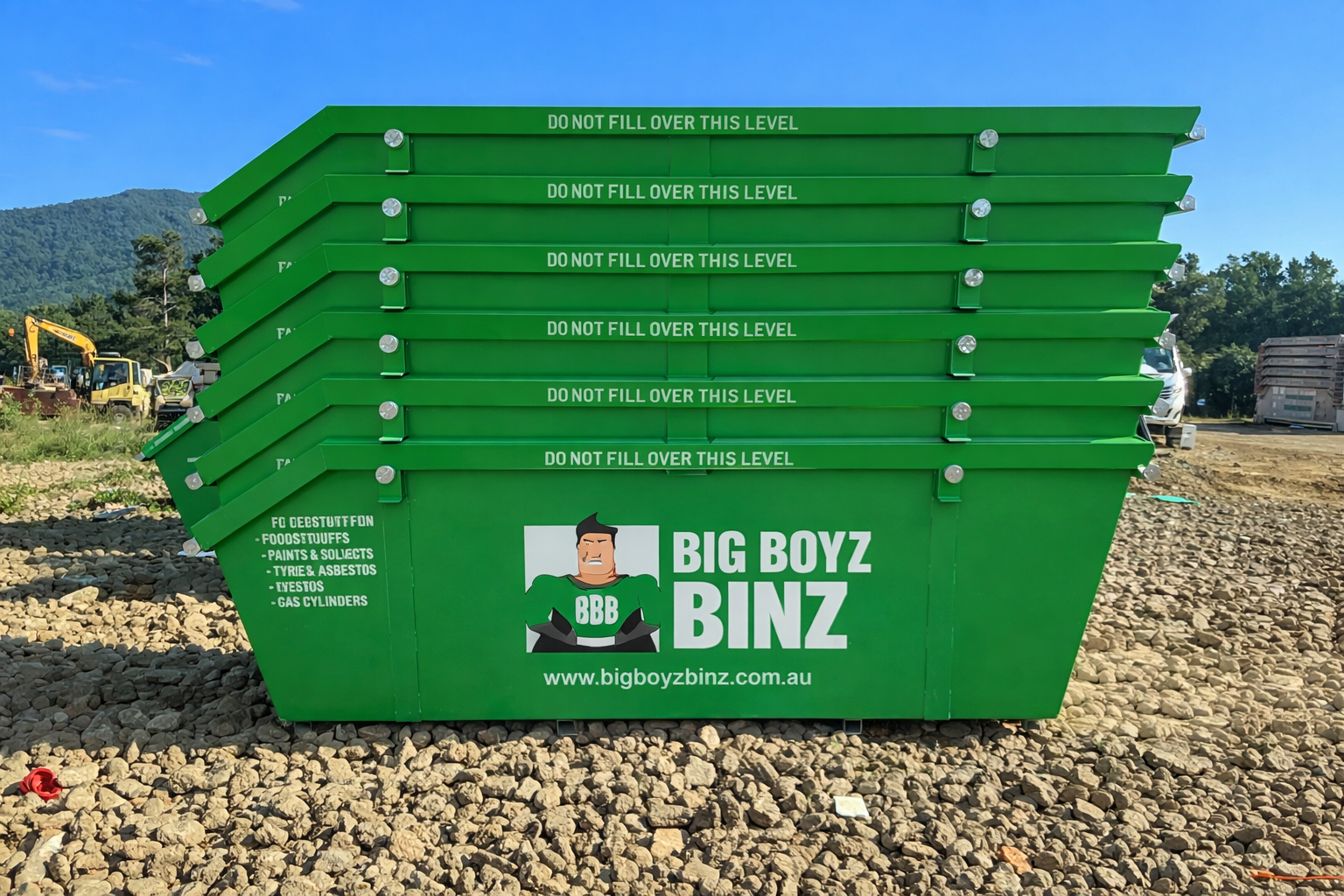 We offer a variety of skip bins sizes at Big Boyz Binz. No matter what you need them for, we will have the size for you. Everything from General waste, Green waste, Household waste, Concrete waste, Clean fill and even Construction waste can be placed into our skip bins. The options that we offer are listed below.
